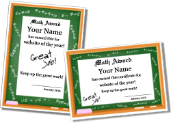 Each printable certificate allows space to enter the students name, a brief description of what the award is for, the date, name of the person awarding the certificate and a signature. Printable award and certificates that teachers can give to their students. Math, other (math), end of year. Included are 56 different awards named after math concepts, math tools, and mathematicians. Want to reward your company's salesperson of the month?